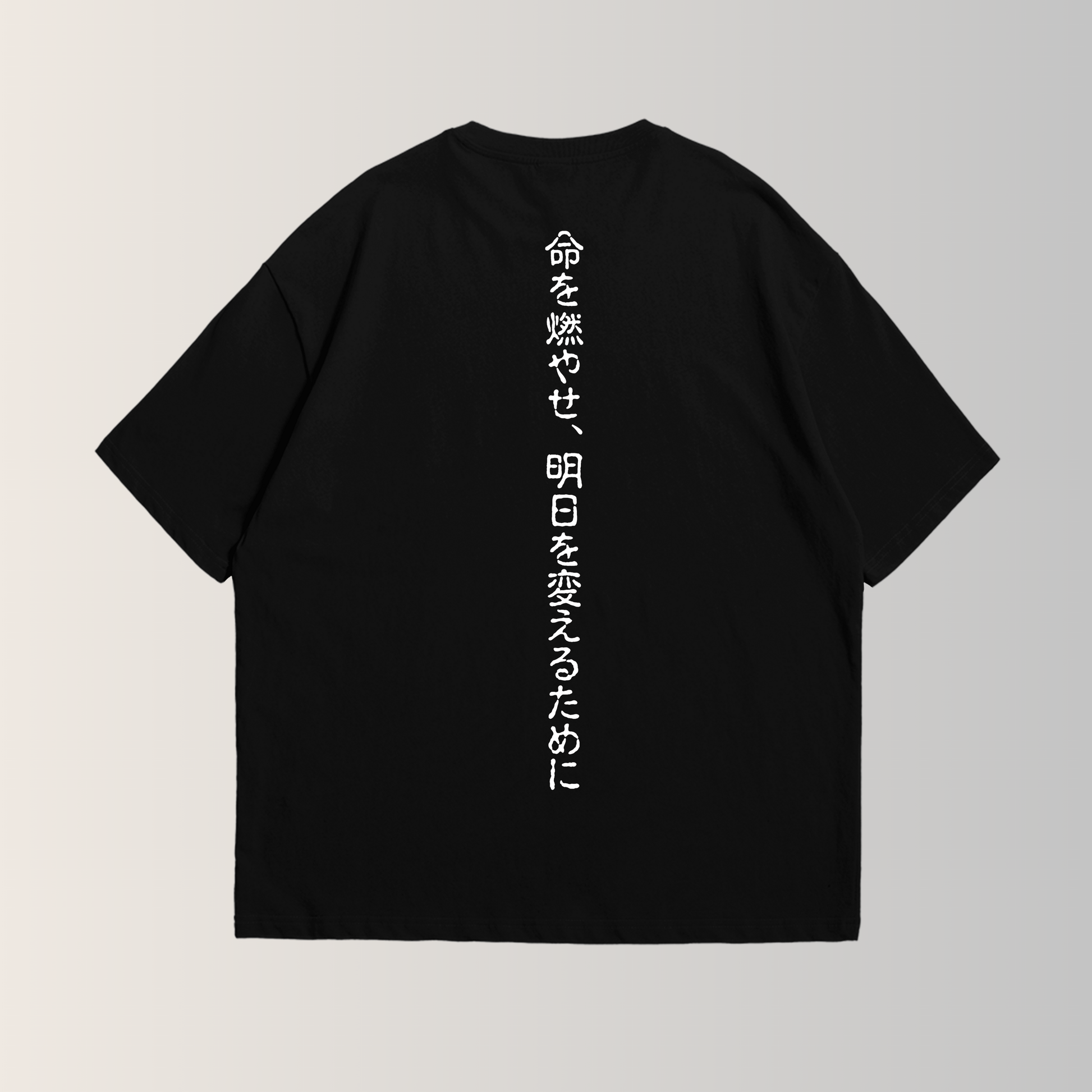 En el frente, luce el emblema de la empuñadura de Rengoku, símbolo de su determinación inquebrantable. En la espalda, la frase en japonés: