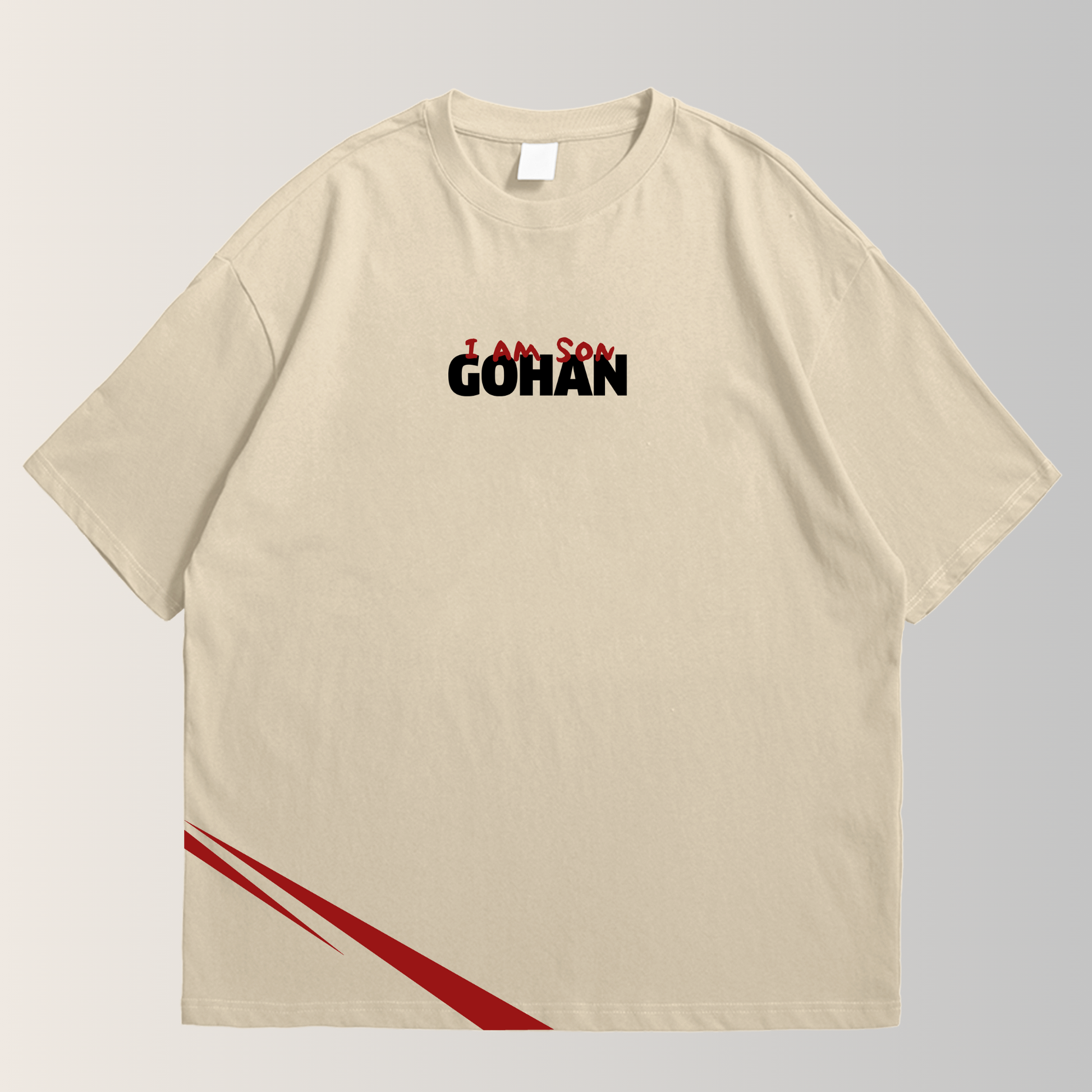 Frontal Declaratorio: El diseño presenta la icónica frase "I AM SON GOHAN" en tipografía audaz. Las palabras en negro y rojo vibrante sobre el fondo claro reflejan la intensidad de su ira y la sangre derramada en la batalla.