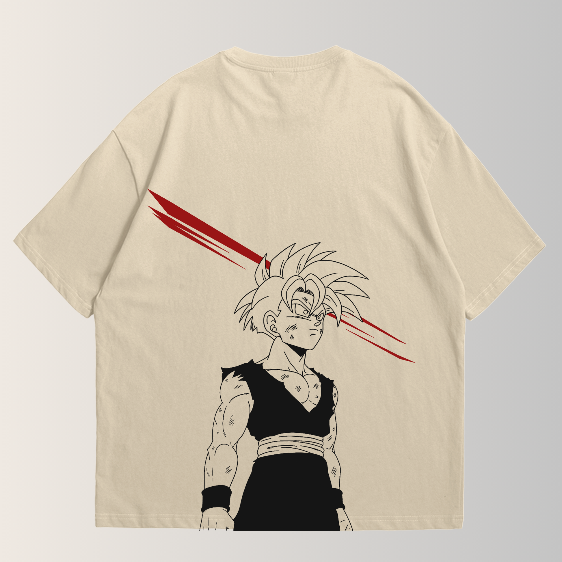 El Guerrrero Desgarrado en la Espalda: En la parte trasera, se ve a Gohan con su traje rasgado, cubierto de heridas y con una mirada de absoluta convicción. El arte lineal en blanco y negro resalta su musculatura y el daño recibido. Cruza la espalda una marca diagonal roja que sugiere la herida crucial o el corte que desata su transformación.