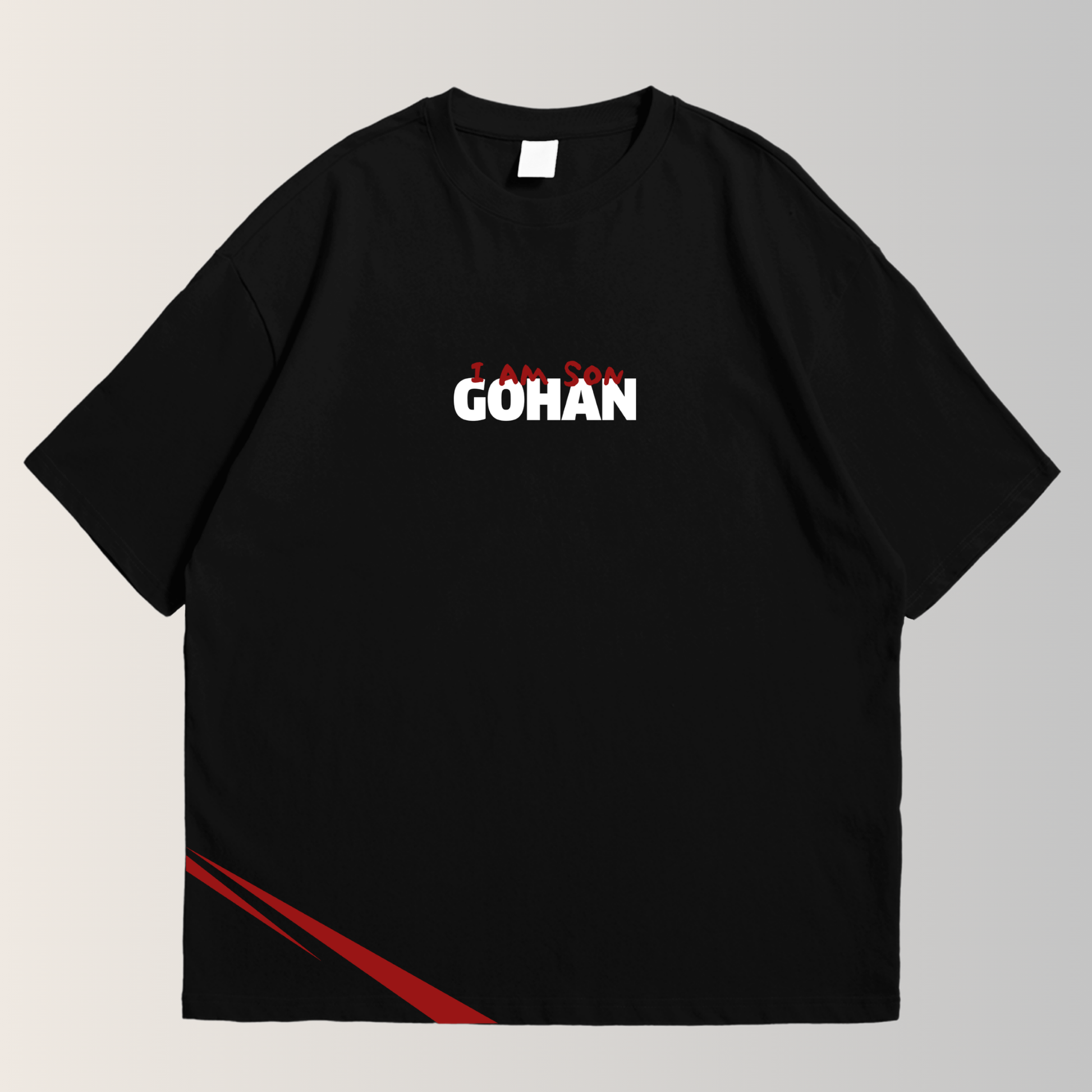Frontal Impactante: La declaración "I AM SON GOHAN" resalta con fuerza. El nombre "GOHAN" en blanco sobre el fondo negro, acompañado de la parte superior en rojo, crea un contraste poderoso que captura la explosión de su carácter.