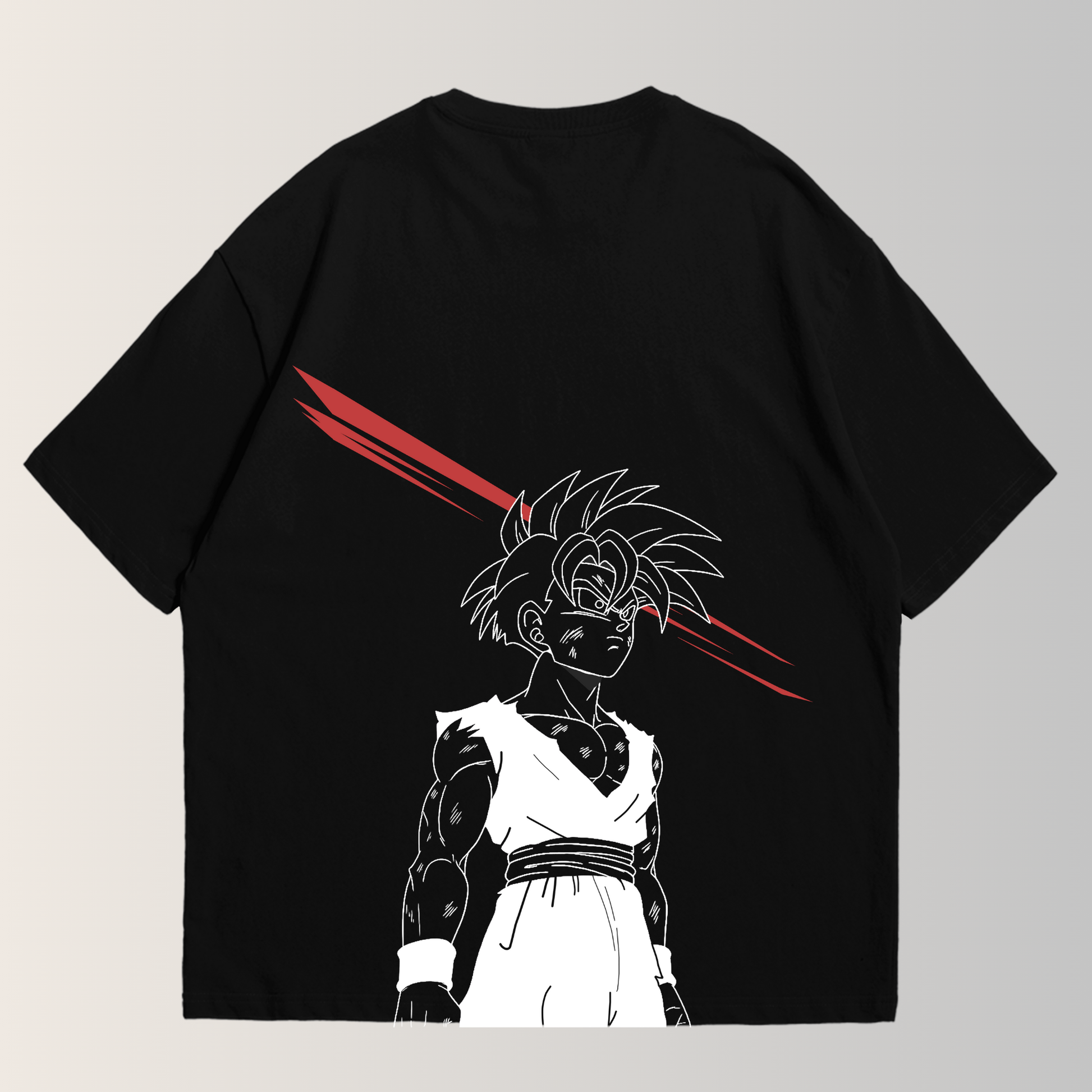 La camiseta en negro eleva la intensidad de la transformación de Gohan en el primer Super Saiyan 2. Simboliza el despertar del potencial latente y el momento épico donde el guerrero asume su rol como el más fuerte, marcado por el dolor y la rabia.