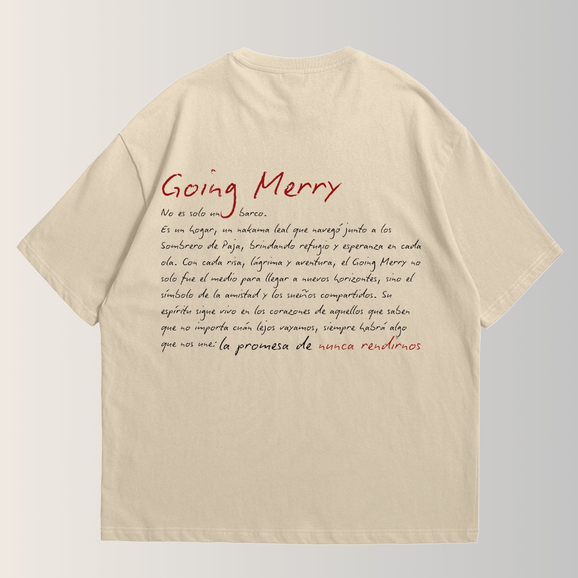 Diseñamos esta playera oversize con todo el cariño de un verdadero nakama: detalles del barco al frente y un mensaje escrito por un nakama en la espalda, porque cada aventura merece ser llevada con orgullo. 👕