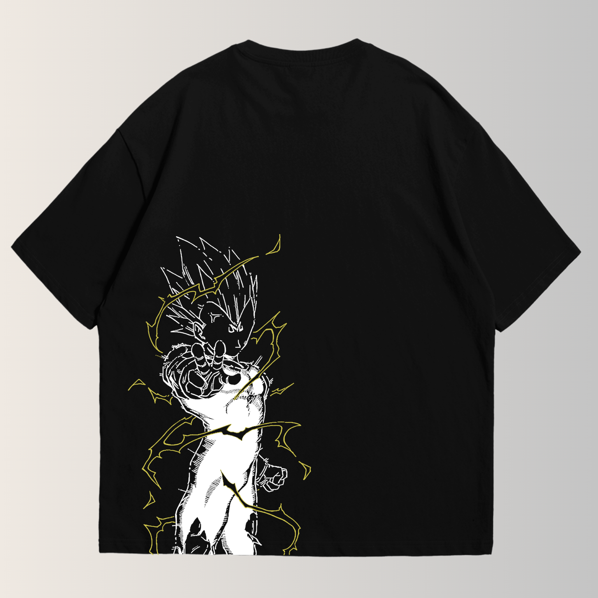 La Furia en la Espalda: La parte trasera muestra a Majin Vegeta en su pose de ataque más emblemática, un torbellino de energía Super Saiyan 2. El diseño en blanco y negro resalta la figura de Vegeta, mientras que los destellos de energía en un vibrante color amarillo capturan la explosión de su fuerza.